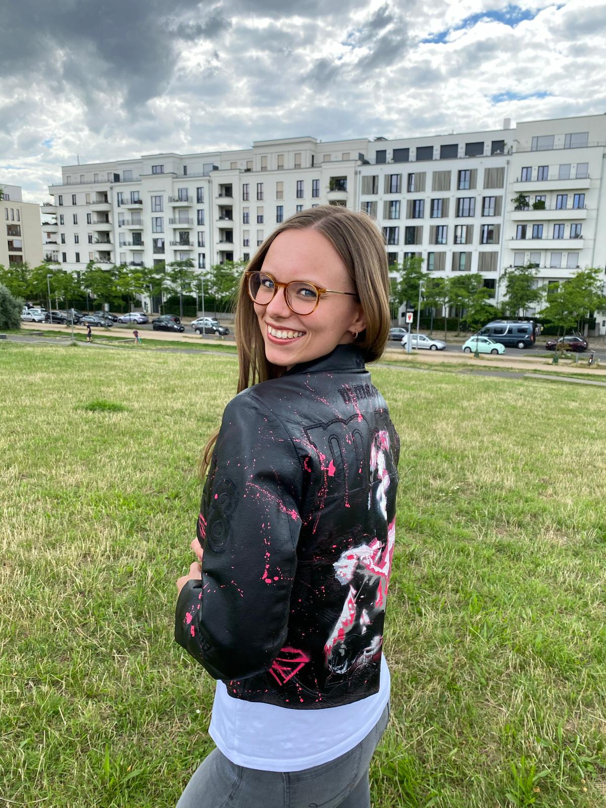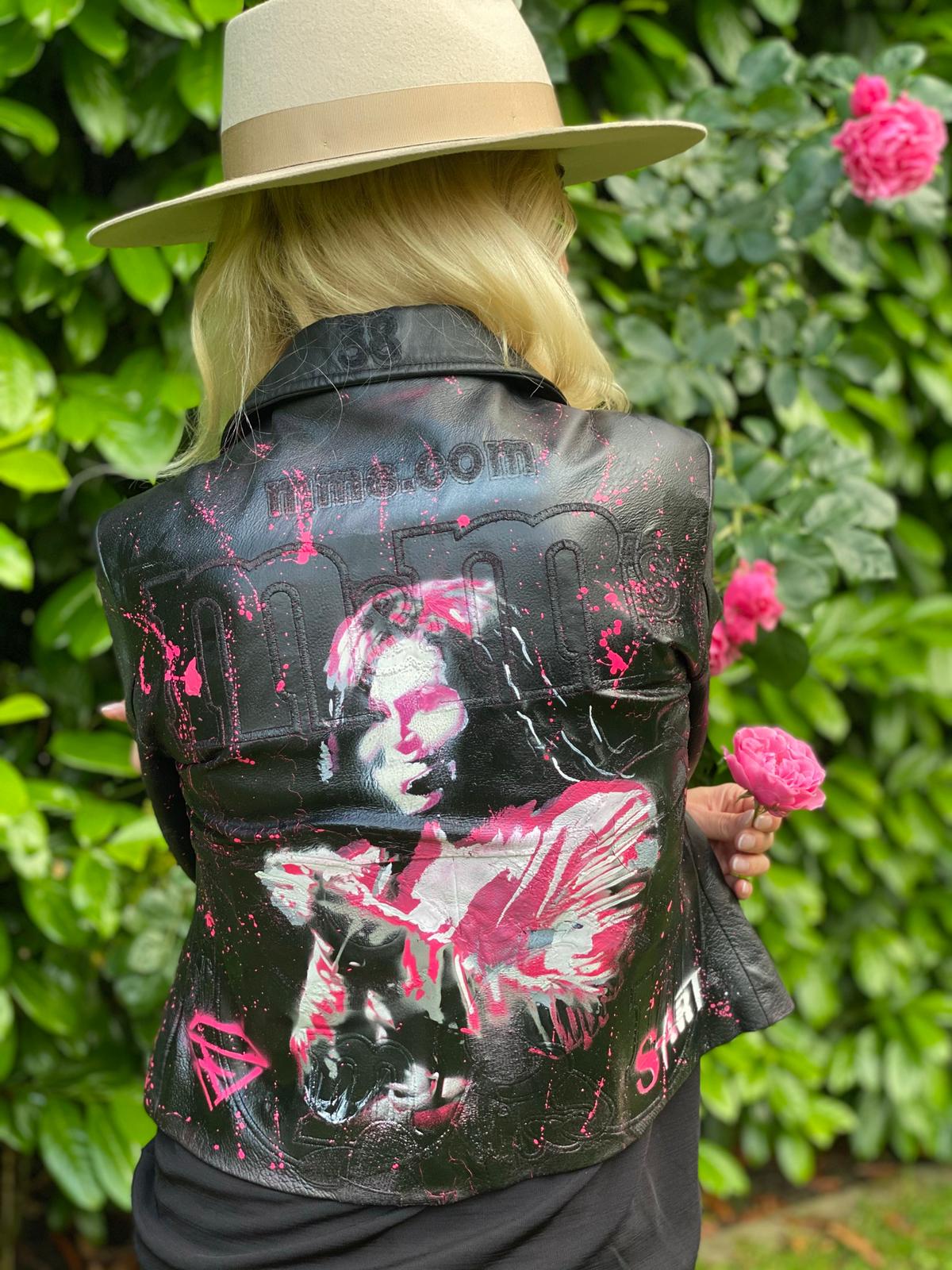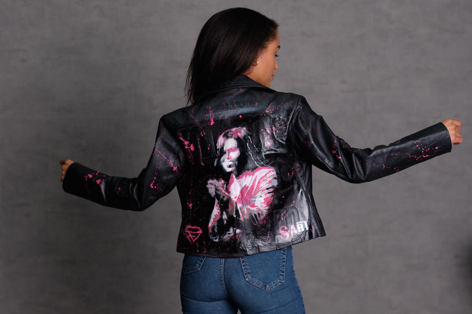 eine einzigartige Lederjacke die dank dem Künstler S-Art Michelle Obama auf dem Rücken trägt.